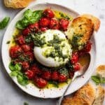 Bursty Tomato Burrata Salad is a luscious and rustic Italian-inspired appetizer or light meal featuring juicy roasted cherry tomatoes, creamy burrata cheese, dollops of fresh basil pesto, a swish of extra virgin olive oil, and crusty bread for mopping up the delicious juices. This simple yet elegant dish highlights the creamy texture of burrata paired perfectly with the burst of flavorful roasted tomatoes and aromatic pesto, ideal for a refreshing and satisfying starter or light meal.